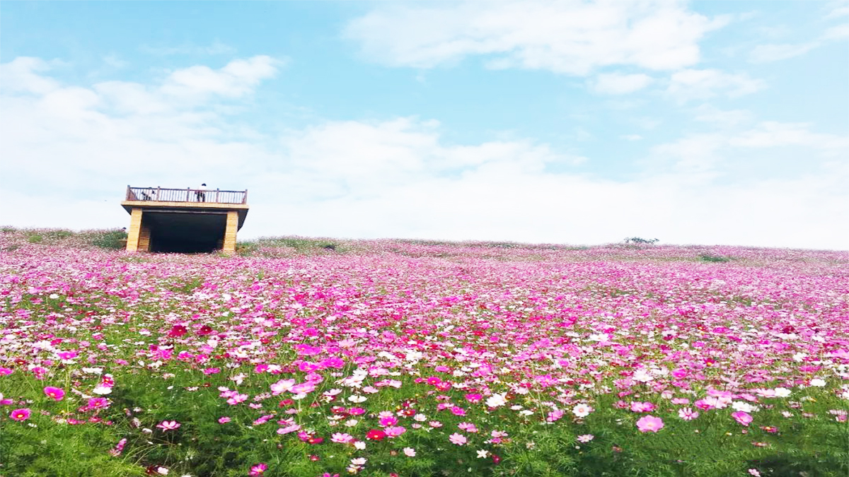 (2)多品種組合種植:根據(jù)草本花卉的生長特性、株高、色系等,模擬野生草本植物群落進(jìn)行合理配置三種以上的草本植物,進(jìn)行大面積場地的種植。能達(dá)到花色范圍廣、層次感強(qiáng)、觀賞效果好,并且開花期長在春、夏、秋三季開花的優(yōu)點(diǎn)。通過草本花卉的自播繁衍能力景觀效果可持續(xù)兩三年,是近期草本植物花海景觀營造形式發(fā)展的趨勢。該營造形式的不足在于花海培育周期長,要達(dá)到最佳觀賞效果需要相對較長的時(shí)間。種植時(shí)要根據(jù)不同營造地點(diǎn)的氣候類型和需要的景觀效果選擇適合的草本花卉組合。